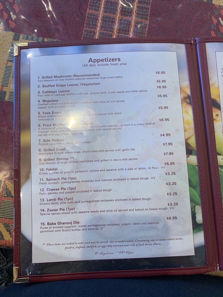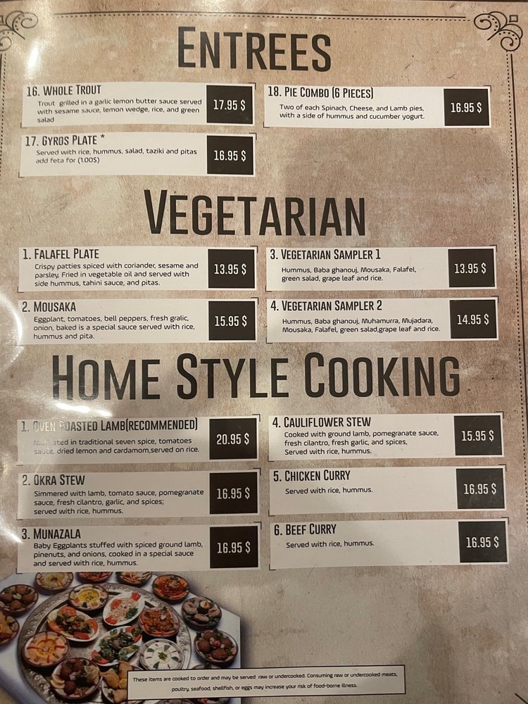 Hummus, baba ghanouj, mousaka, falafel, green salad, grape leaf and rice, pita.